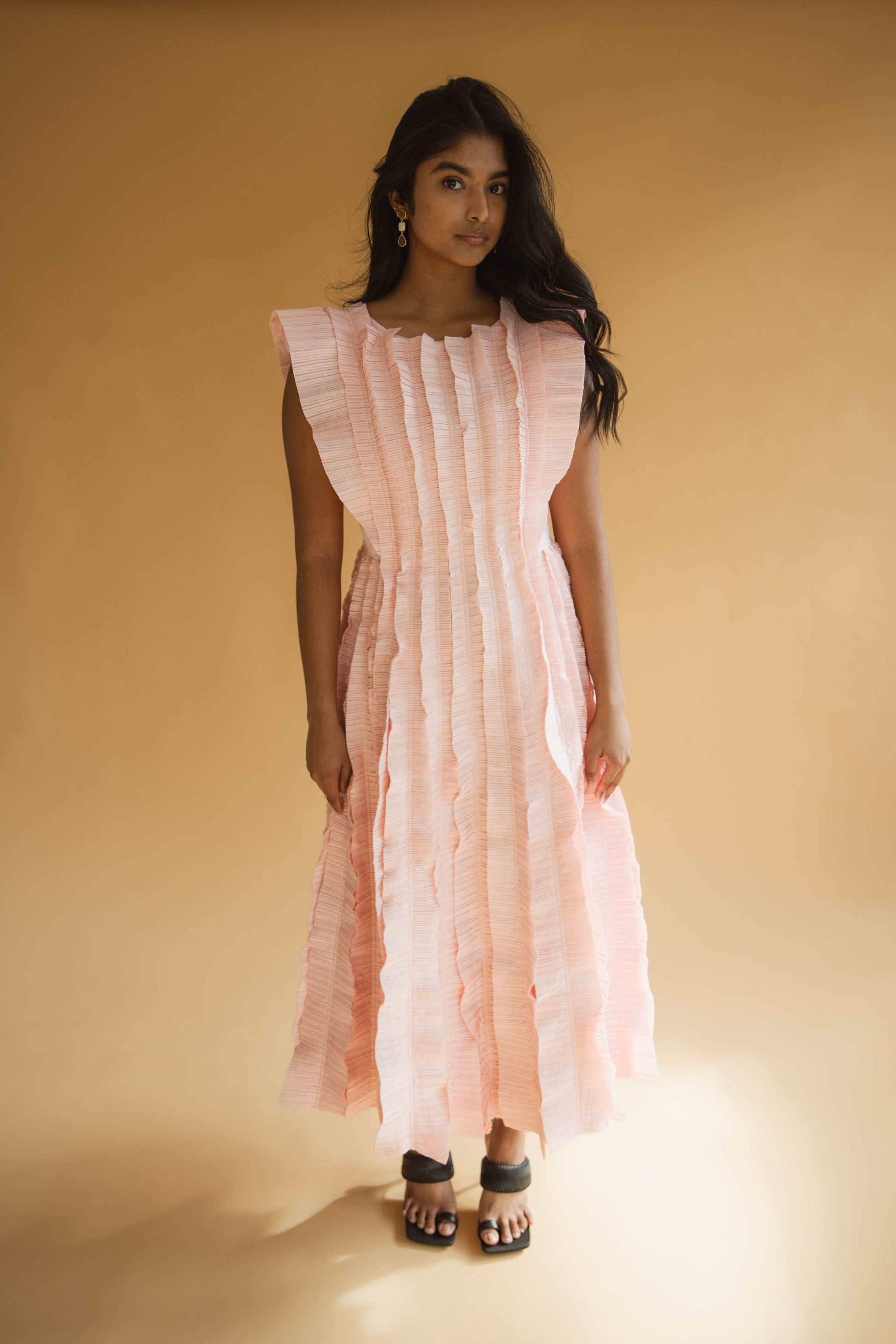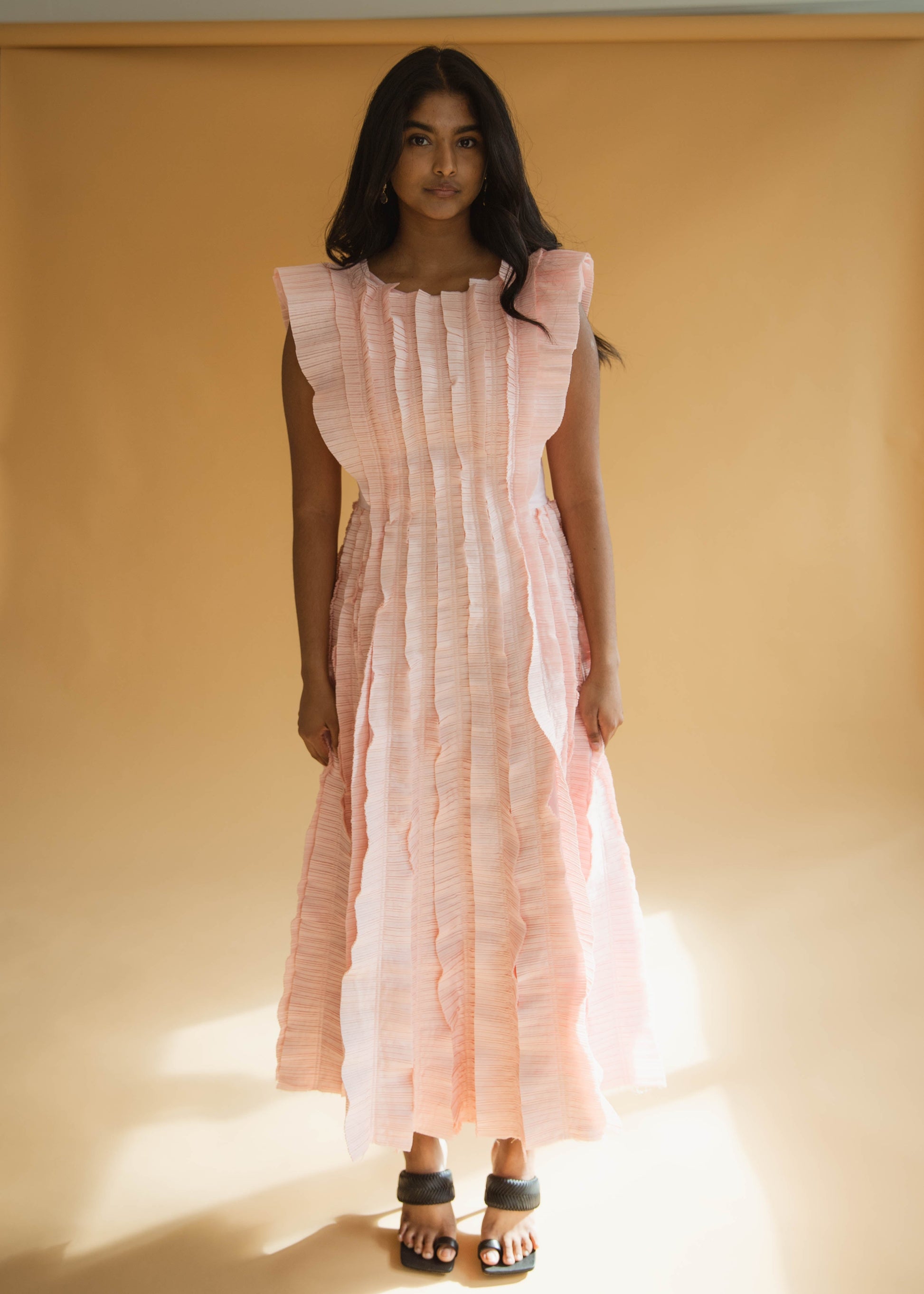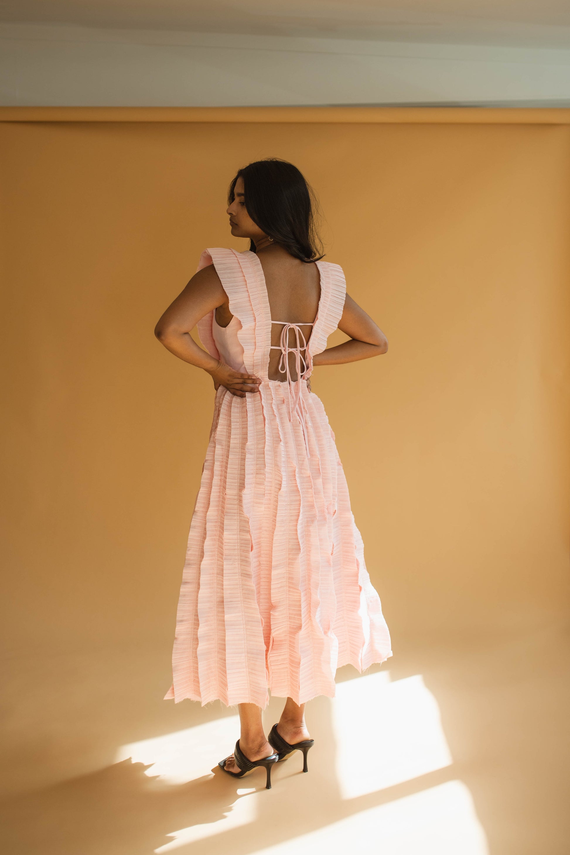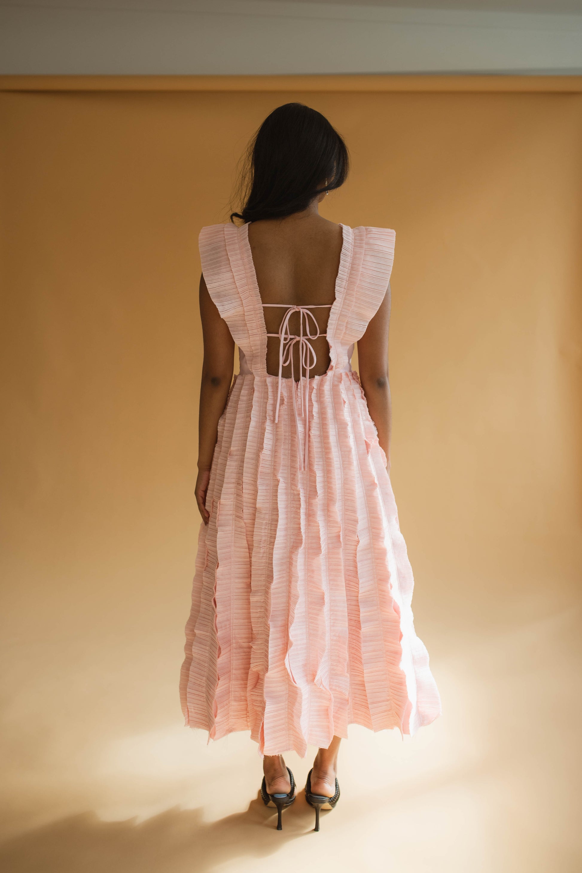 Fitted through the body and lusciously textured with pleats throughout, take in an open back with tie detail and barely-there cap sleeve. We are absolutely obsessed.