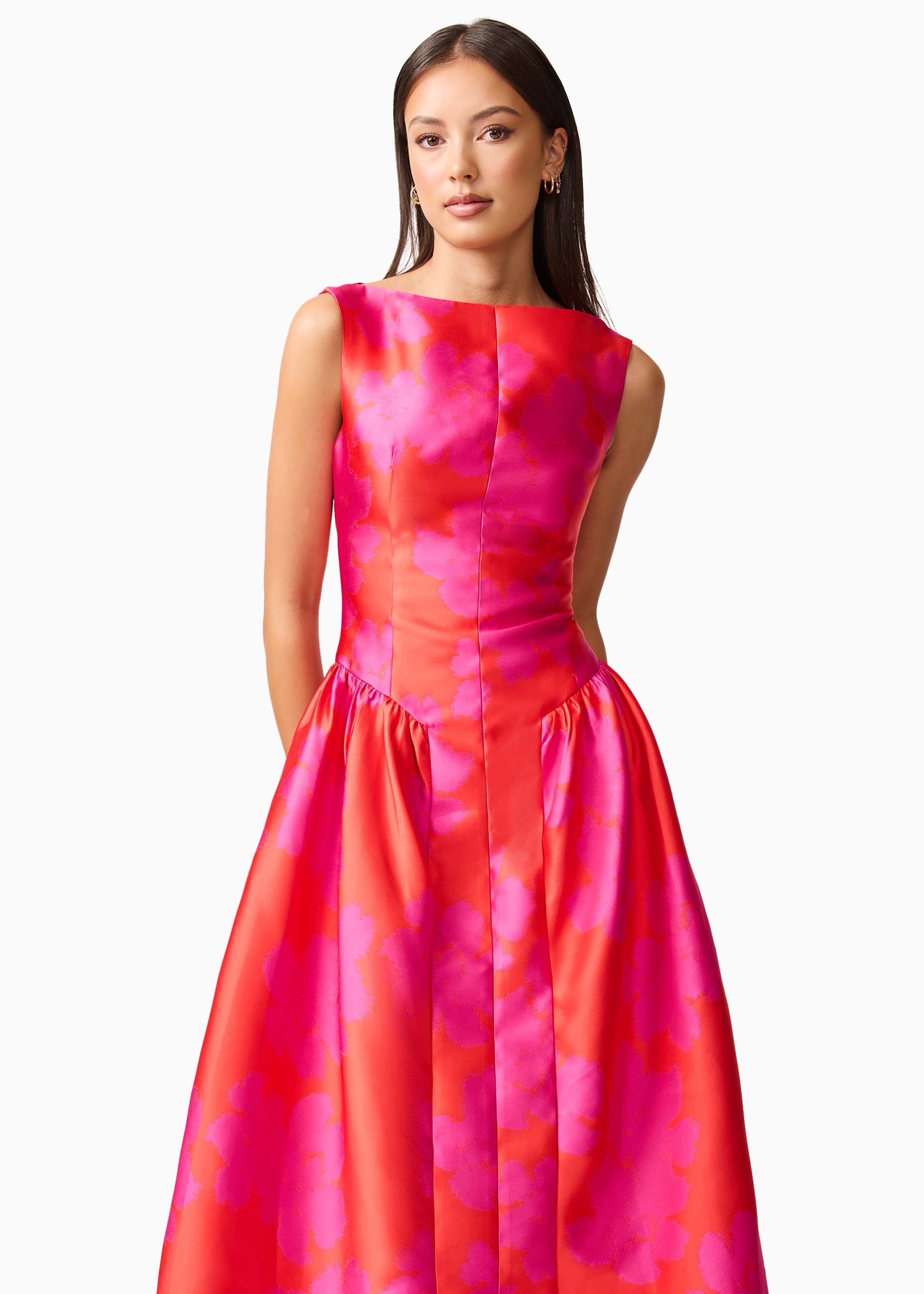 Featuring a flattering drop waist, body-skimming bodice, high back cut out and A-line midi skirt in a playful print, it's an occasion dress ready to make memories.