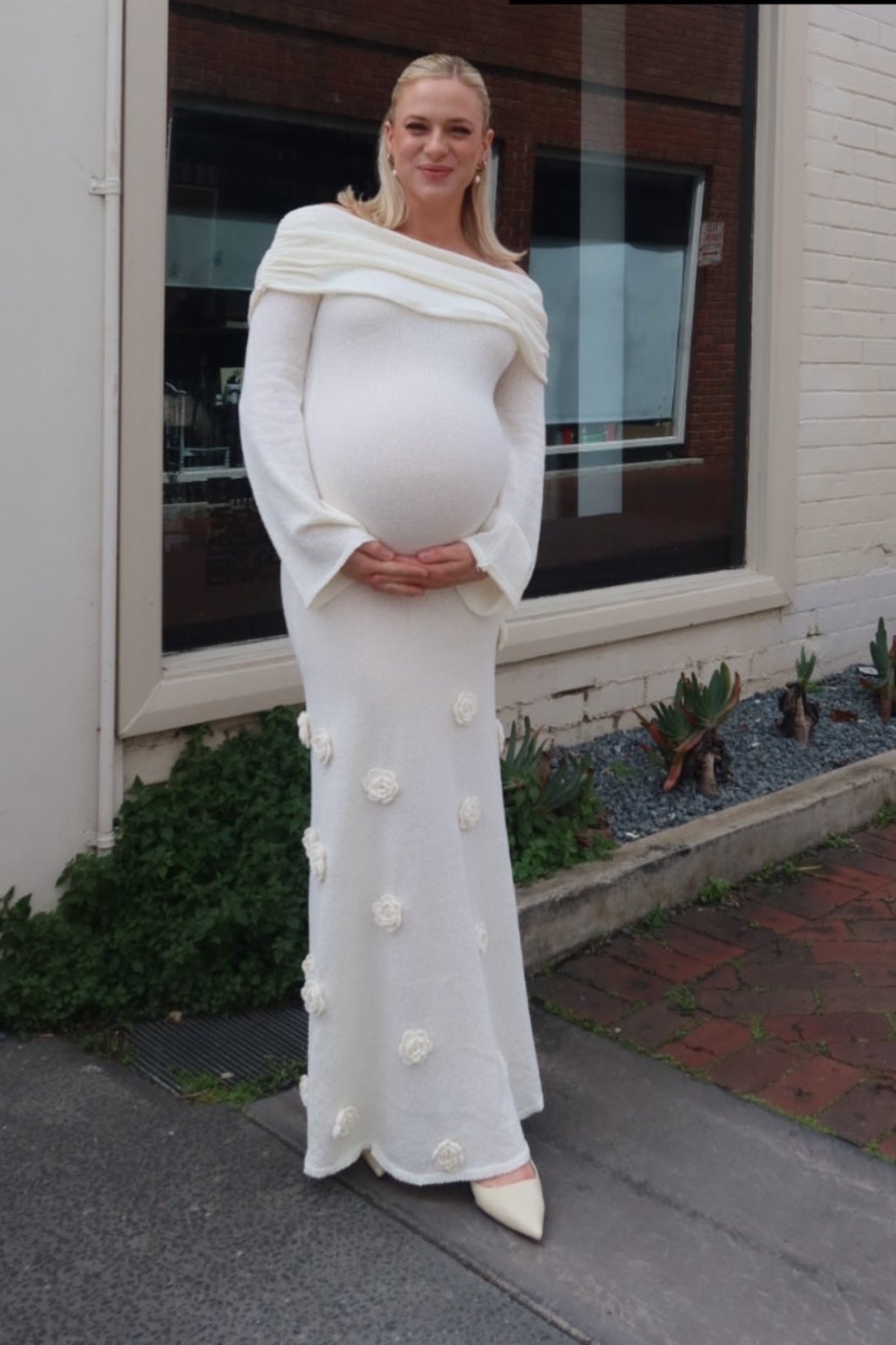 Meshki Kiki Off Shoulder Knit Rose Maxi Dress, Ivory